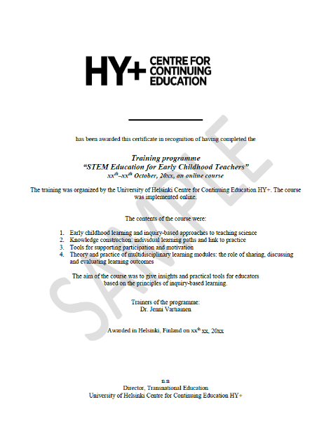除了STEM教育内容,您还将学习基于探究的学习方法,您也可以在其他领域应用。您将对幼小阶段学习者的科学教学充满信心。如果您从100学分中获得70学分,您还将可以获得赫尔辛基大学继续教育学院颁发的证书。本课程的主要目标是建立有能力和自信的教育者,他们可以在幼儿学习中实施科学教育。